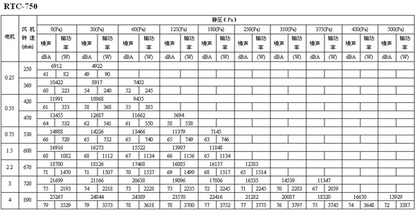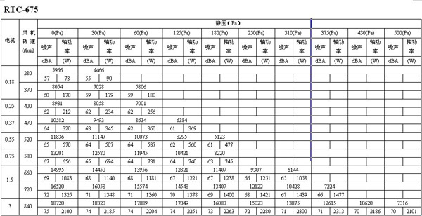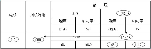 如下面的表格所示,如果选用风量为16273m3/h,静压为30Pa的风机,其转速为600 r/min,声压级为68dB(A),实际耗功率为1112W,选配电机功率为1.5kW。