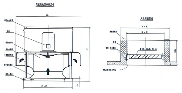 3、机壳:本风机整体结构强度按50m/s极端室外风速的条件进行设计。风机采用铝合金材质,经拉伸、卷边等加工,在保障风机足够强度的前提下,提高了风机外形的美观,减轻了风机的自重,降低了对屋顶基础的强度要求,且抗风能力较好。