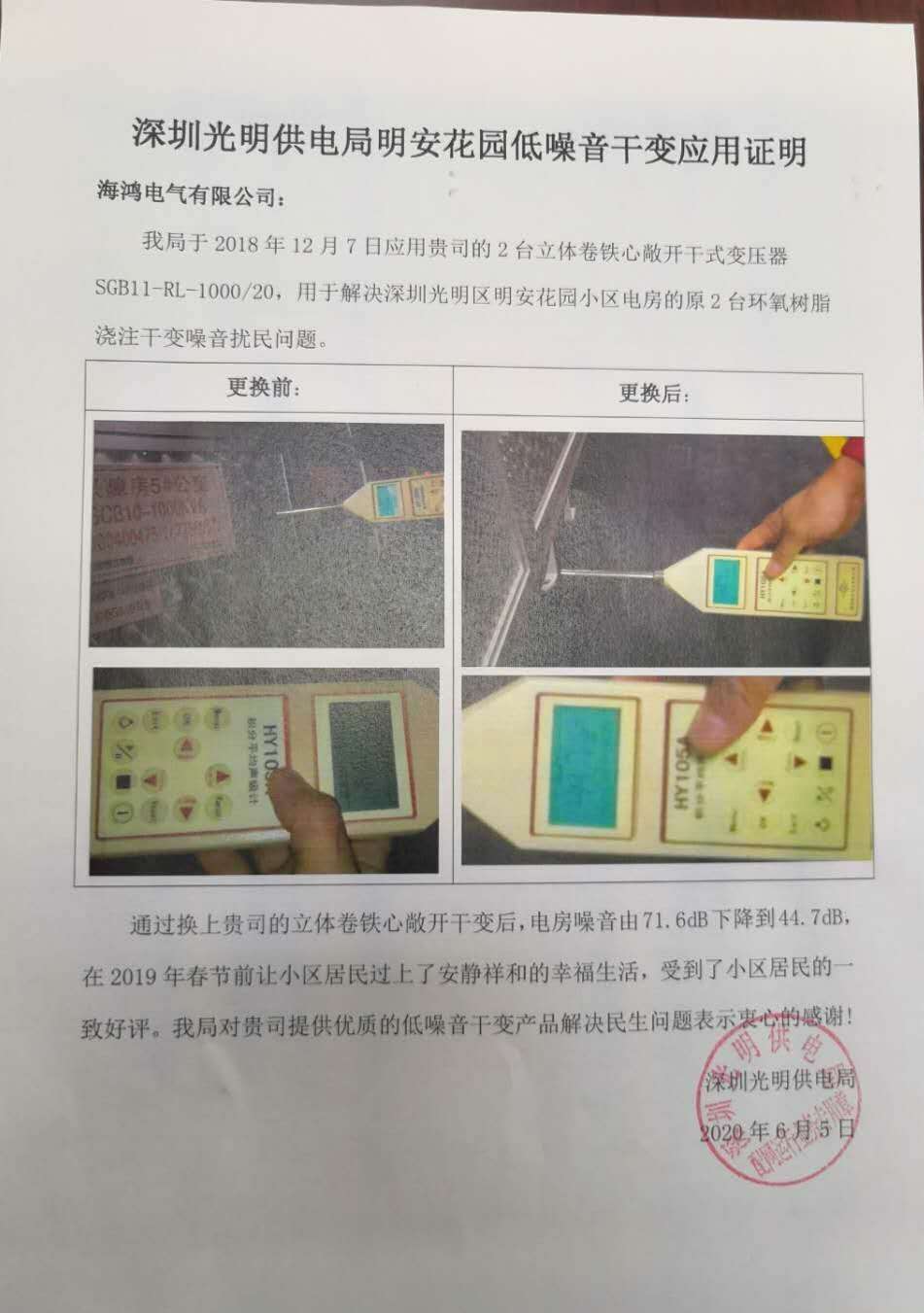 2018年12月7日深圳市光明区明安花园因小区电房原2台环氧树脂浇注干变噪音扰民,而更换888集团电气两台SGB11-RL-1000/20敞开式立体卷铁心干式变压器。888集团电气产品安全可靠、宁静运行的优势让明安花园重获安静祥和,并得到小区居民与深圳光明供电局高度认可。