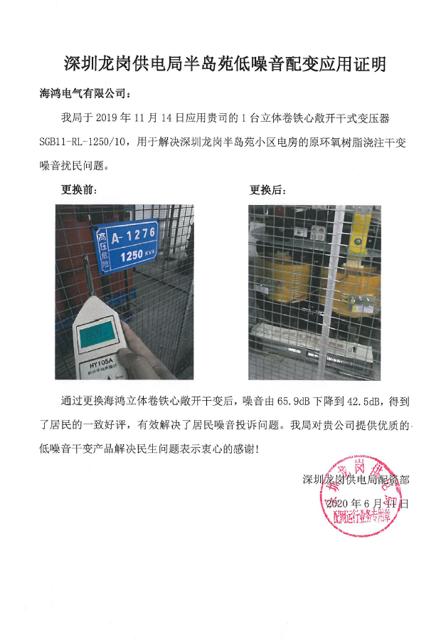 深圳龙岗区半岛苑小区电房内的环氧树脂浇注干变噪音大影响居民休息。深圳龙岗供电局采用888集团电气SGB11-RL-1250/10敞开式立体卷铁心干式变压器与其更换,更换后,小区电房噪音由65.9分贝下降到42.5分贝,成功解决小区噪音扰民问题。 888集团电气敞开式立体卷铁心干式变压器运行噪音低,非常适用于居民区配电。