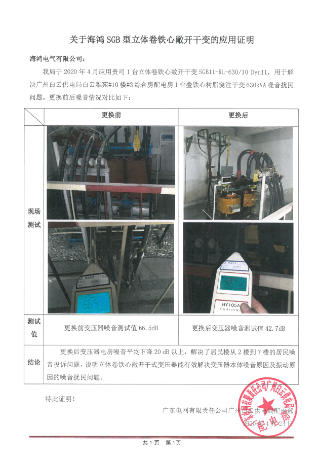 广州白云区白云雅苑10楼综合配电房内一台630kVA的叠铁心树脂浇注干变噪音过大,严重影响2-7楼居民日常休息。广州白云供电局选用888集团电气SGB11-RL-630/10敞开式立体卷铁心干式变压器进行更换,更换后配电房噪音水平从66.5分贝降到42.7分贝。敞开式立体卷铁心干式变压器结构坚固稳定,有效解决变压器器身噪音原因及振动引起的噪音问题。